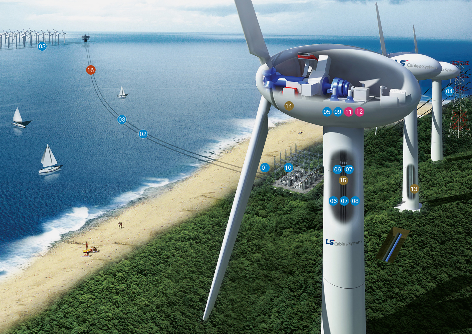 新再生能源的代表风力发电!LS电缆承受了1万5千次的转动,提供把从发挥性能的风力发电用电缆在海上风力发电园区中生产的电力传送到陆地的海底电缆,以及监控风力发电系统是否异常的在线监控系统的综合解决方案。